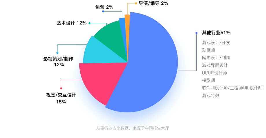 随着互联网和新媒体行业的迅速发展,近年来对数字媒体艺术设计专业的人才需求也逐渐上涨,2022-2027年中国数字媒体行业市场需求与投资咨询报告数据显示,数字媒体相关专业的从事行业是多元化的,占比最高的是交互设计、其次是影视制作、艺术设计,运营等。